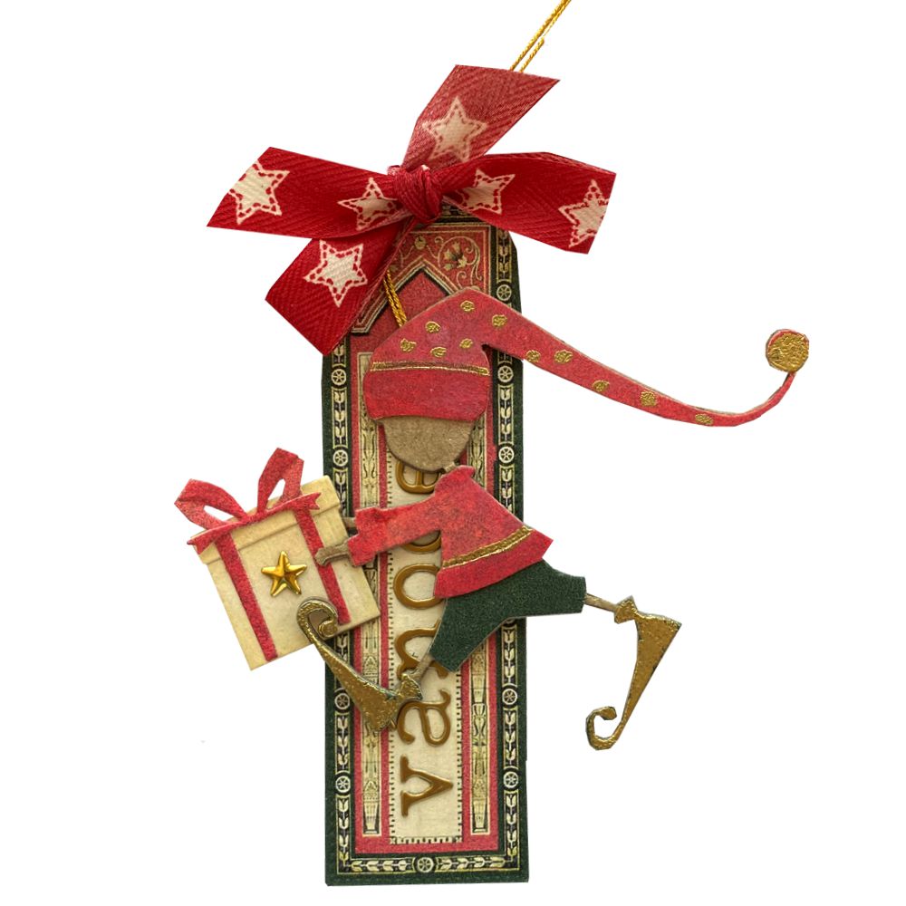 Visačka na vánoční dárek v designu vánoční kolekce pro rok 2023 s motivem skřítka a nápisem "vánoce".