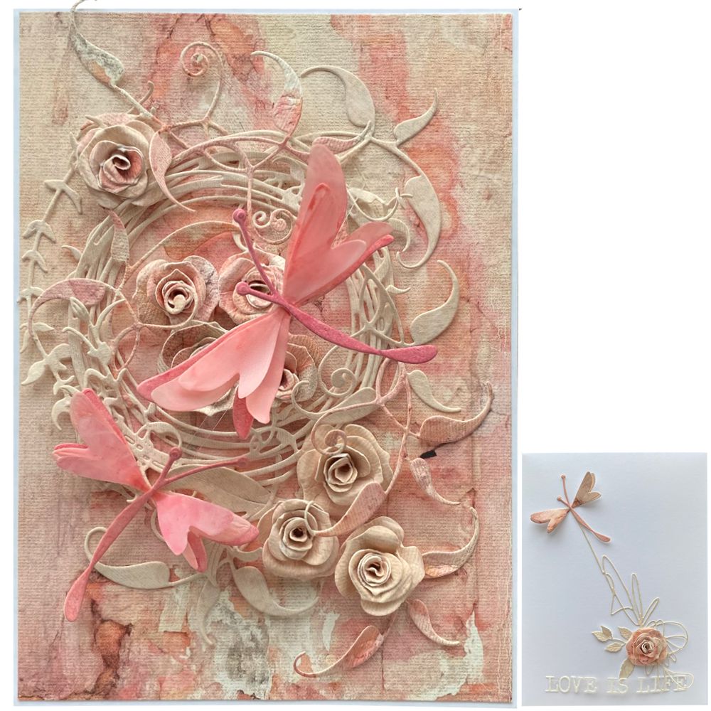 Něžné přáníčko s krabičkou. Přání v jemných růžových barvách, vážky se vznáší nad květinami. Krabička je ozdobena tak, aby ladila s přáníčkem.