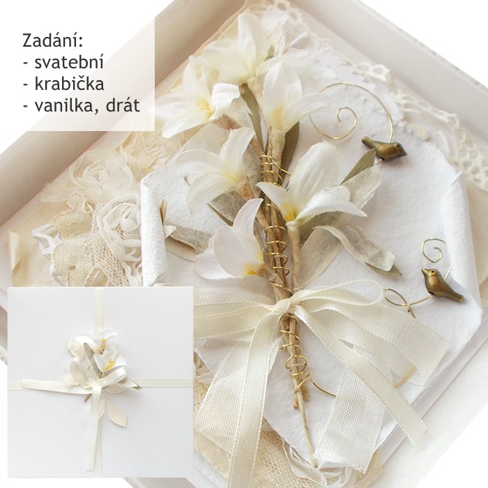 Svatební přání s dárkovou krabičkou. Požadavky - vanilka, drát.
