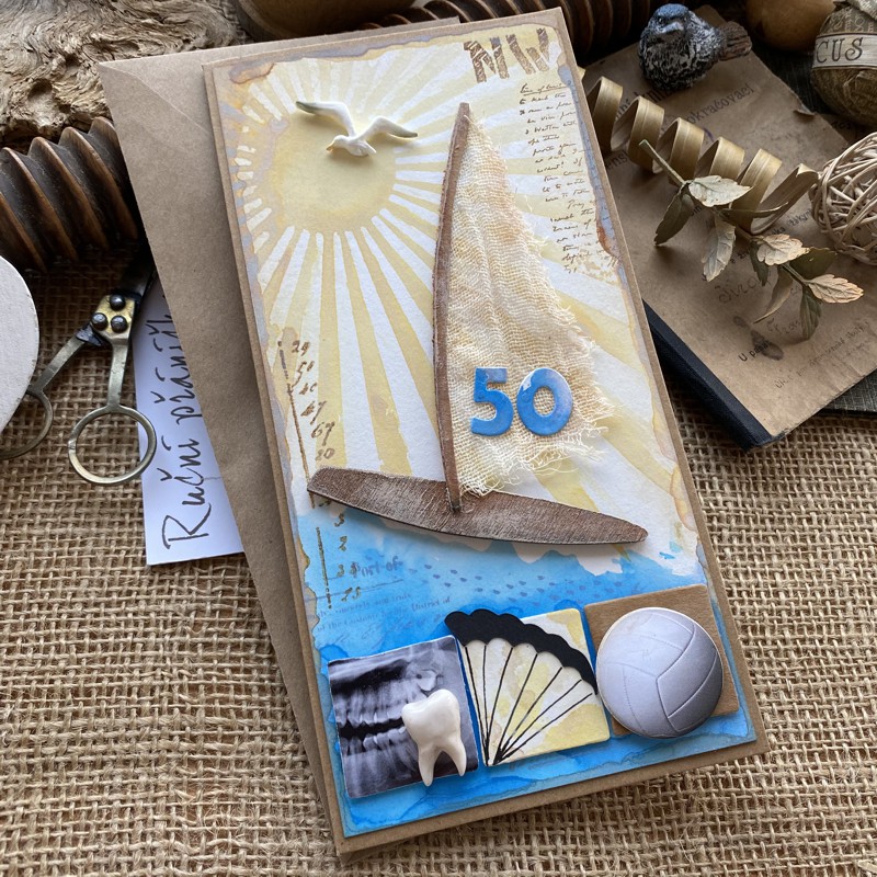 Přání k 50. narozeninám. Téma windsurfing, zubařka, padák a volejbal.