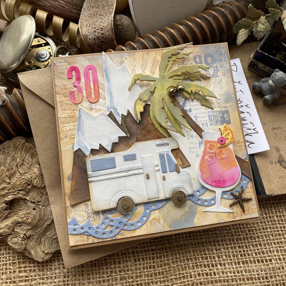 Přání k 30. narozeninám. Téma cestování, hory - moře a míchaný nápoj.