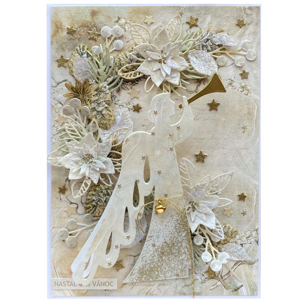 Základ je rozevírací papírové přání (bílé, gramáž papíru 300g). Papírová dekorace, rolnička.