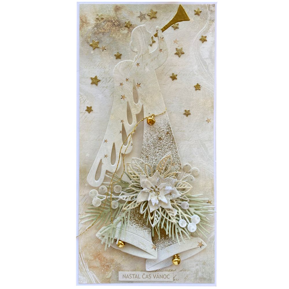 Základ je rozevírací papírové přání (bílé, gramáž papíru 300g). Papírová dekorace, rolnička.