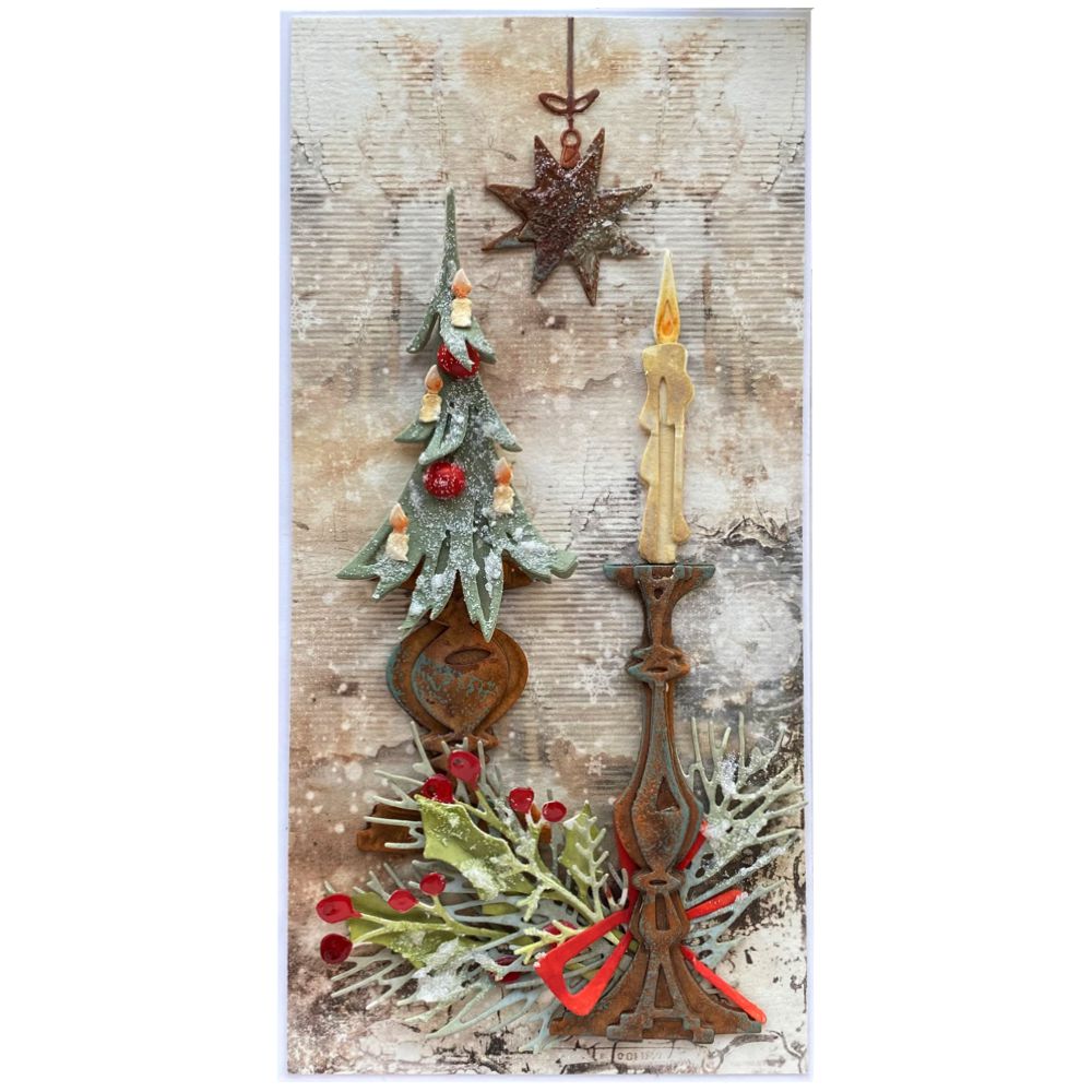 Vánoční přáníčko v rustikálním stylu. Dekorované svícny s ozdobou.