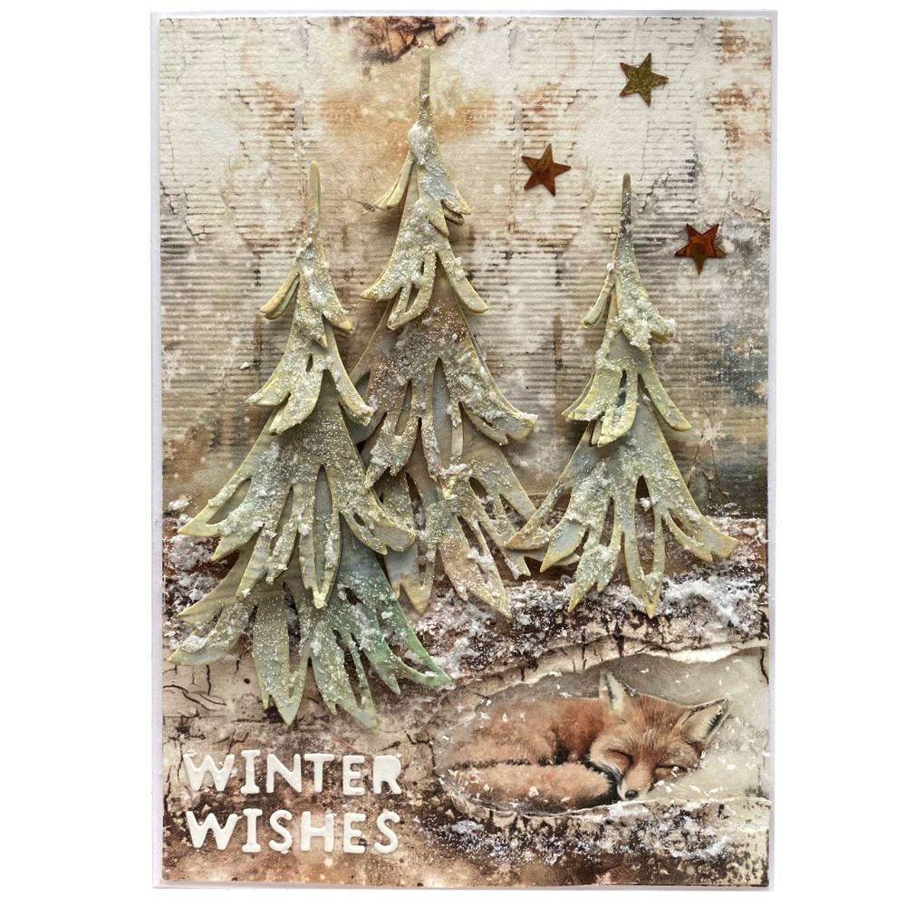 Základ je rozevírací papírové přání (bílé, gramáž papíru 300g). Papírová dekorace, dřevěné doplňky, šňůrka.