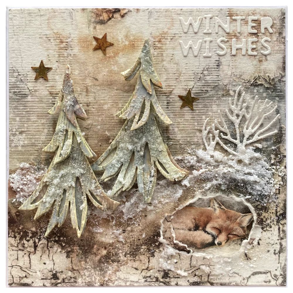 Zimní nebo vánoční přáníčko. Liška v pelíšku.