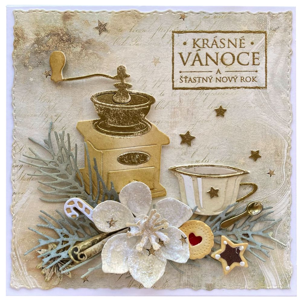 Přáníčko k Vánocům s mlýnkem a dekorací.