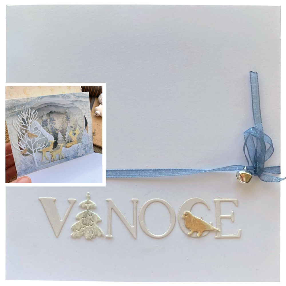 3D přáníčko k Vánocům s domečkem a zvířátky v jemných modrých tónech. 3D obrázek se objeví po rozevření přáníčka.