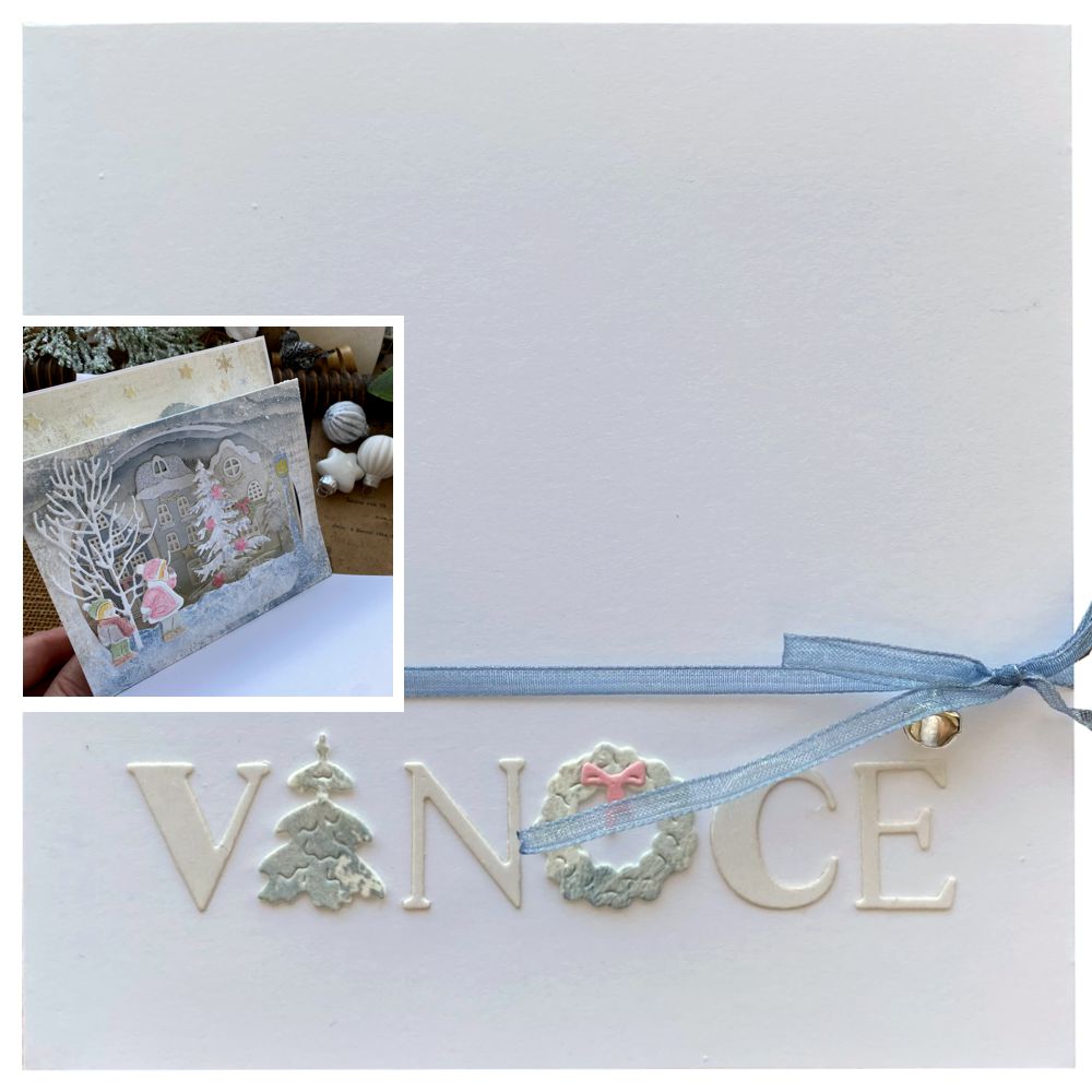 3D přáníčko k Vánocům s domečky a dětmi v jemných modrých tónech. 3D obrázek se objeví po rozevření přáníčka.