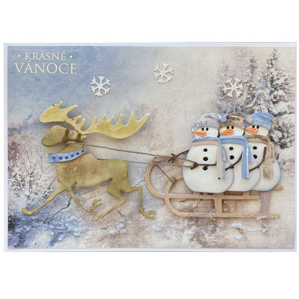 Vánoční přáníčko se sněhuláky na saních se sobem.