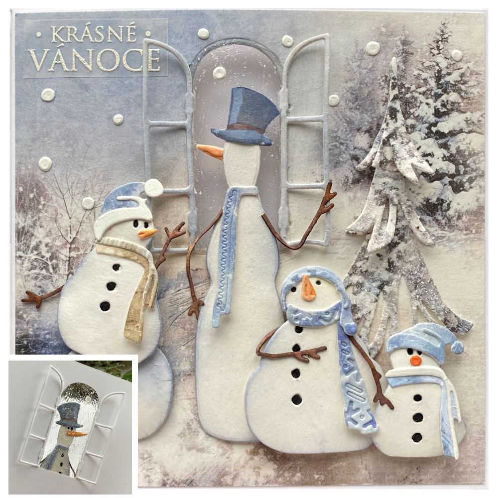 Vánoční přáníčko se sněhuláky. Otevřené okno je oboustranné. Po rozevření přáníčka se sněhulák kouká oknem.
