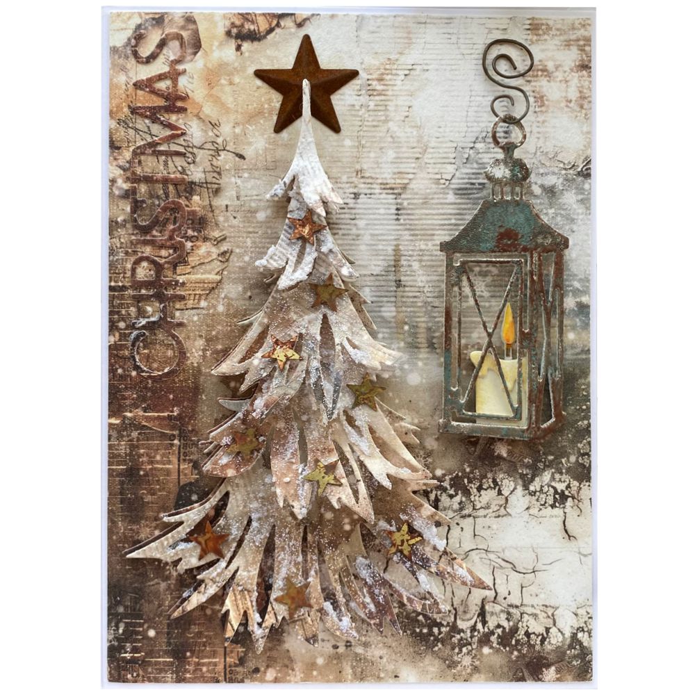Vánoční přáníčko v rustikálním stylu se stromem a lucernou.