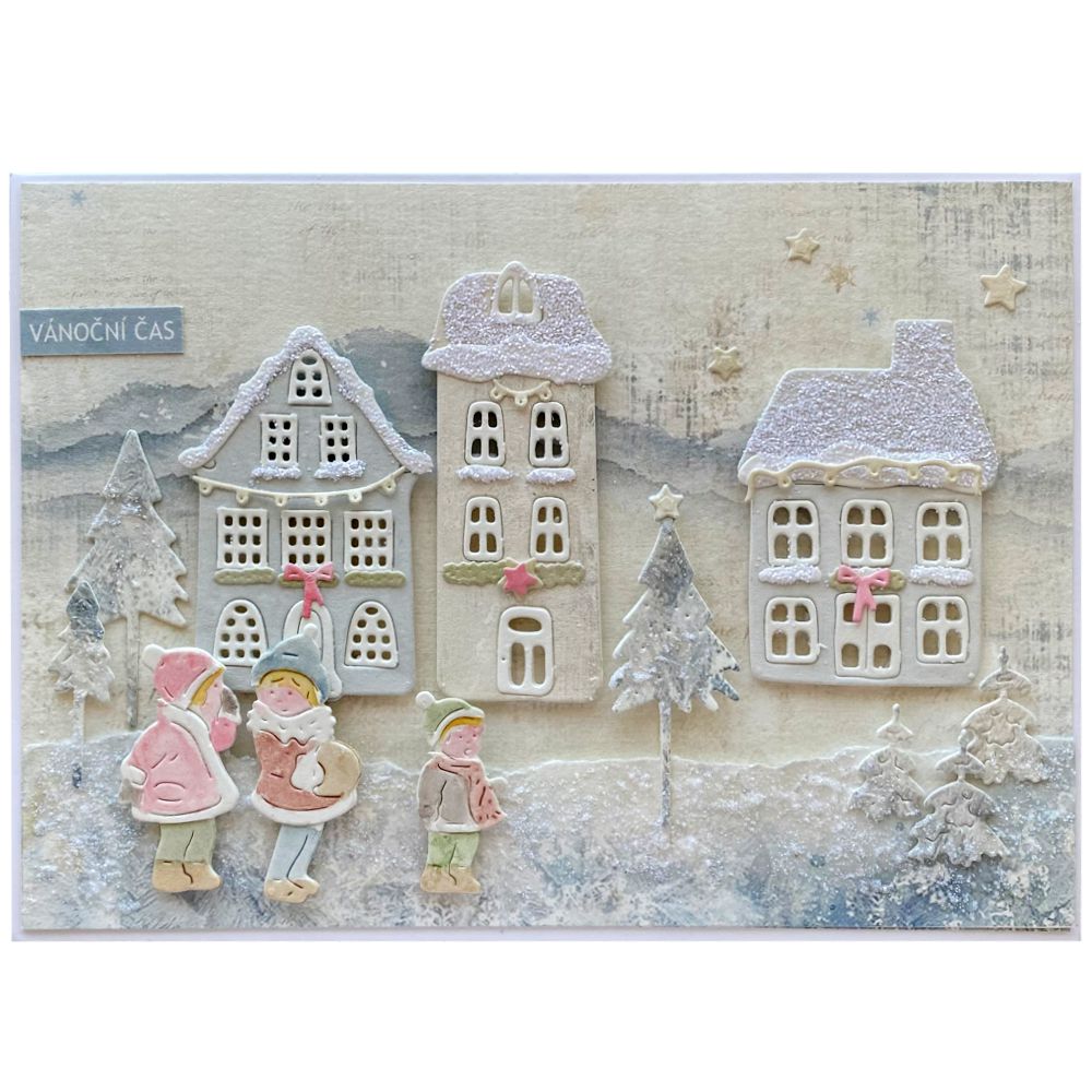 Přáníčko k Vánocům s domečky v jemných modrých tónech zasněžené.