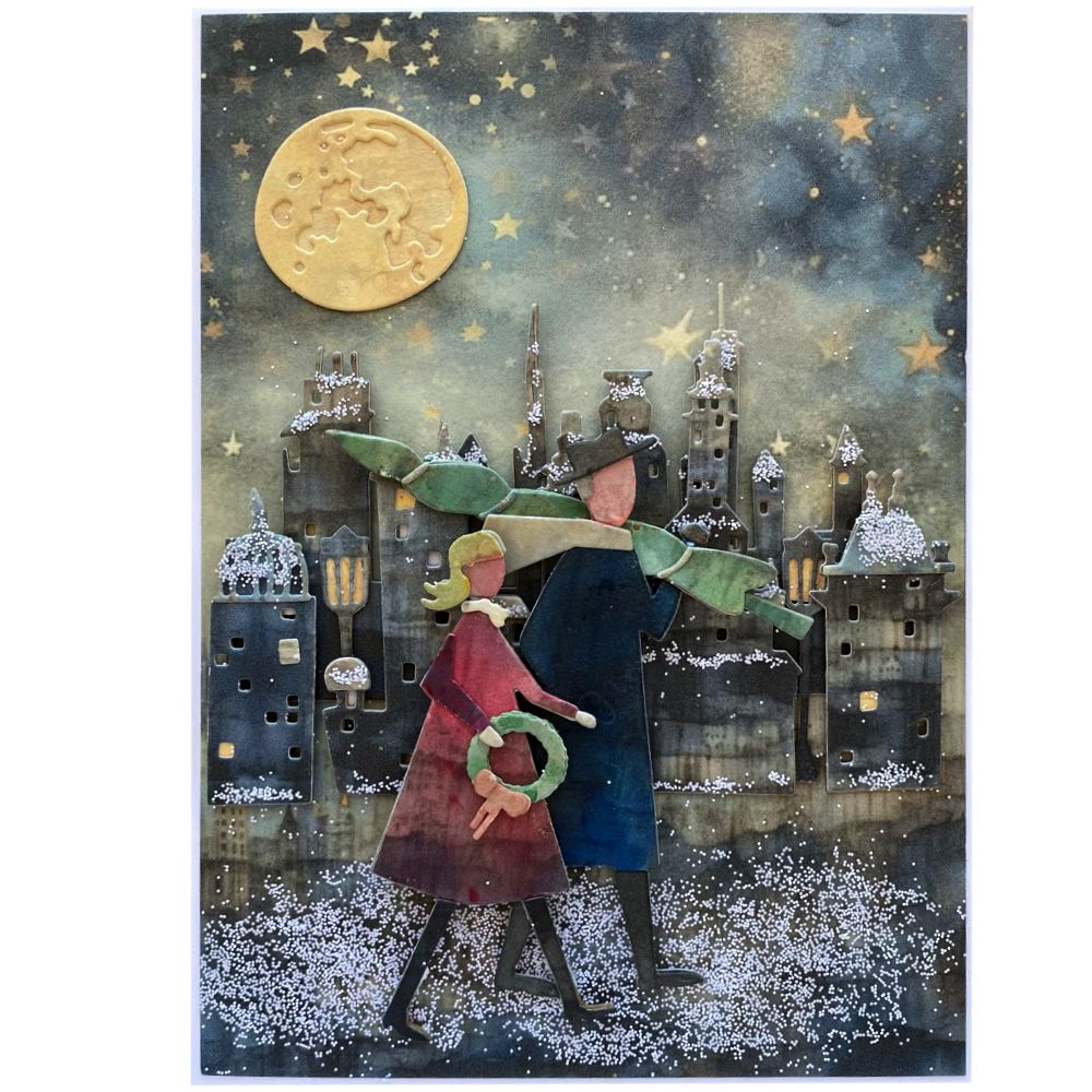 Přáníčko k Vánocům město s domy v noci zasněžené.