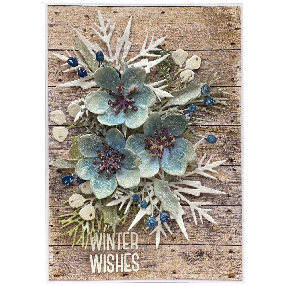 Zimní i vánoční přáníčko se zmrzlými květy. Nápis "winter wishes".